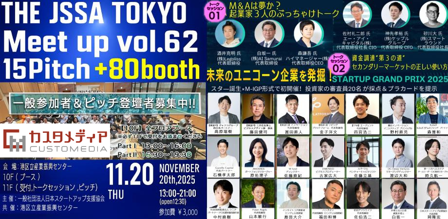 JSSA(一般社団法人 日本スタートアップ支援協会)が主催する「THE JSSA TOKYO Meetup」の目玉企画「スター誕生 × M-1GP形式」で行われるピッチコンテストです。20名の審査員(VC/CVC/エンジェル投資家など)が未来のユニコーンを発掘します。